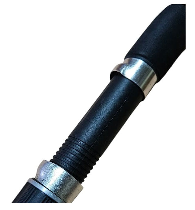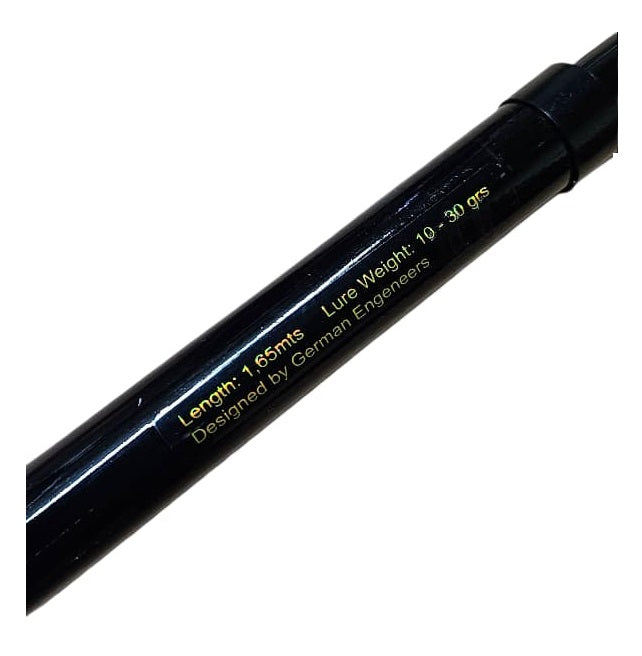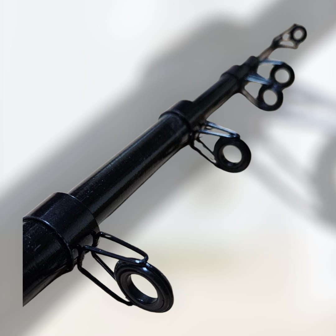 Caña telescopica de 6 tramos, fabricada en fibra de vidrio resistente, con un mango de goma eva que permite un buen agarre y unos pasadores de ceramico que permite tener excelentes lanzamiento y menos fricción en la linea.