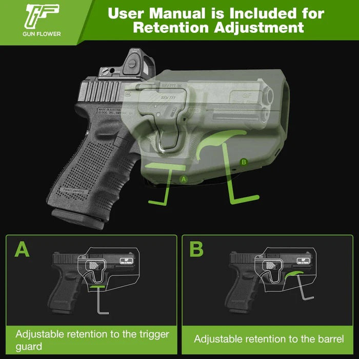 - 【Retroalimentación de bloqueo y cubierta del guardamonte】Esta funda proporciona respuesta de bloqueo con un nítido clic cuando el arma está firmemente colocada en la funda y no saldrá a menos que presione el botón de liberación. Cubre todo el acceso al gatillo, eliminando el riesgo de disparos descuidados y el riesgo de presionar el botón de liberación del cargador.