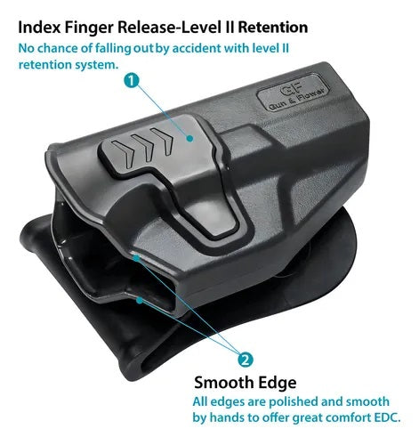 - Sistema de liberación del dedo índice mejorado: Este sistema universal de liberación del dedo índice para fundas, alejado del gatillo de la pistola, ofrece una retención de nivel II más segura. Permite colocar el dedo índice (gatillo) en la posición perfecta para un desenfunde suave y rápido.